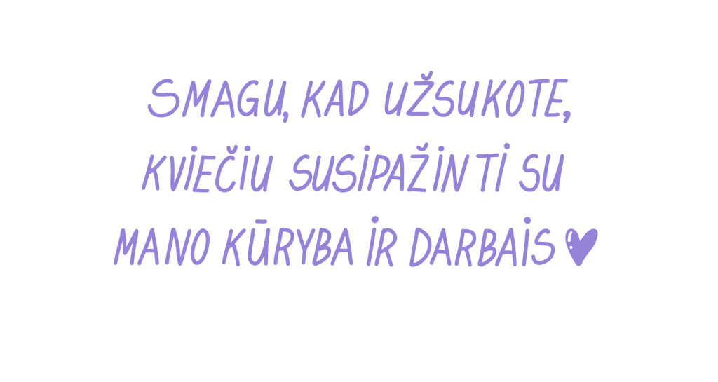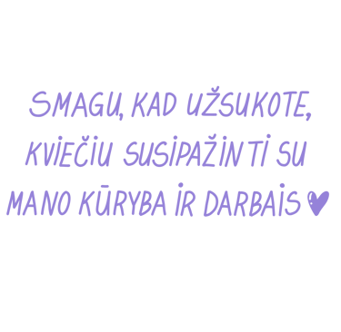 Kūryba mane lydi kiekviename žingsnyje, o galvoje nuolat sukasi idėjos, ieškančios savo formos. Esu kilusi iš mažo miestelio, apsupto pušynų ir nuoširdžių žmonių – ši aplinka įkvėpė mano susižavėjimą gamta, žmogumi ir jų tarpusavio ryšiu. Tai atsispindi ir mano darbuose.